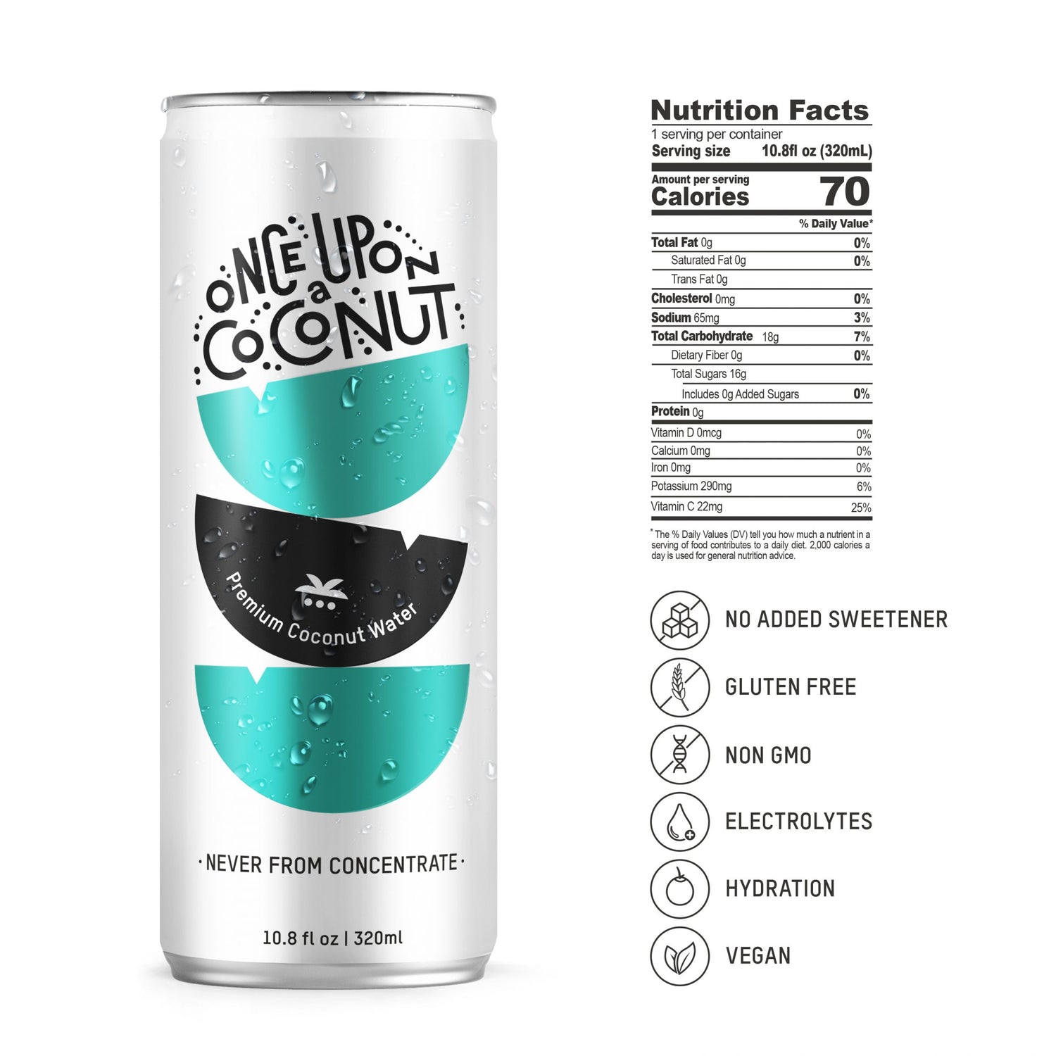 Our premium coconut water contains 70 calories per serving. While our sparkling coconut water + energy contains 75 per serving.